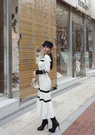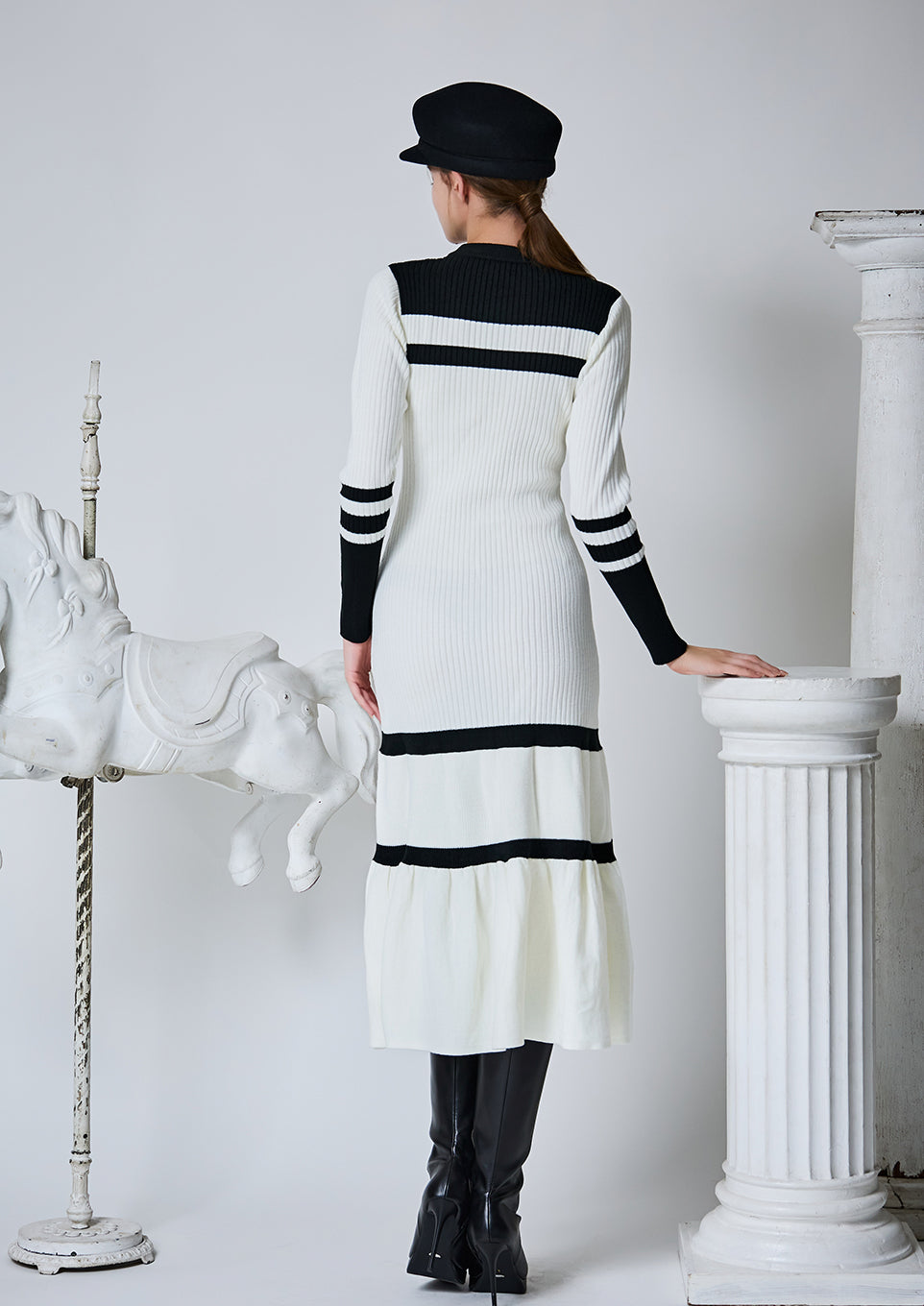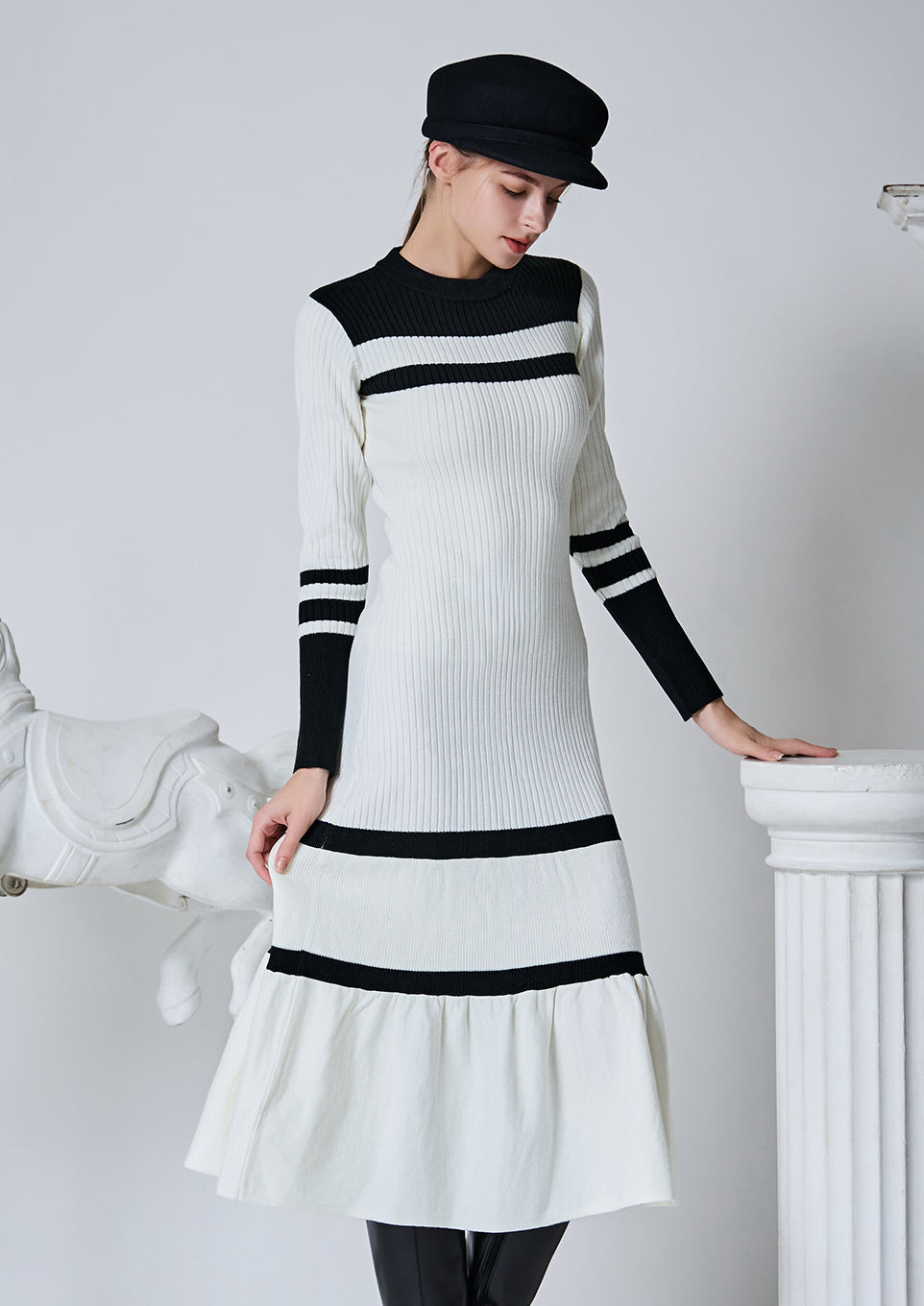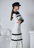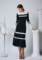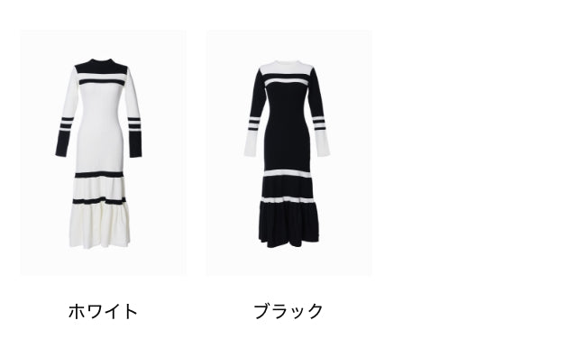 配色とシルエットで魅せる、品のあるクールな佇まいのバイカラーリブニットワンピース。