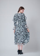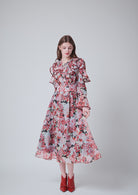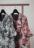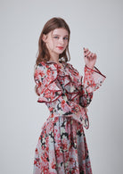 肩から胸元を飾る大胆なフリルが、華やかな動きを与え、
