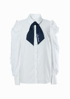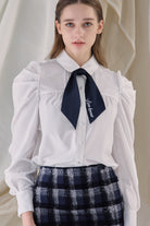 配色の刺繍が施されたスカーフとブラウスのセットアイテム。
